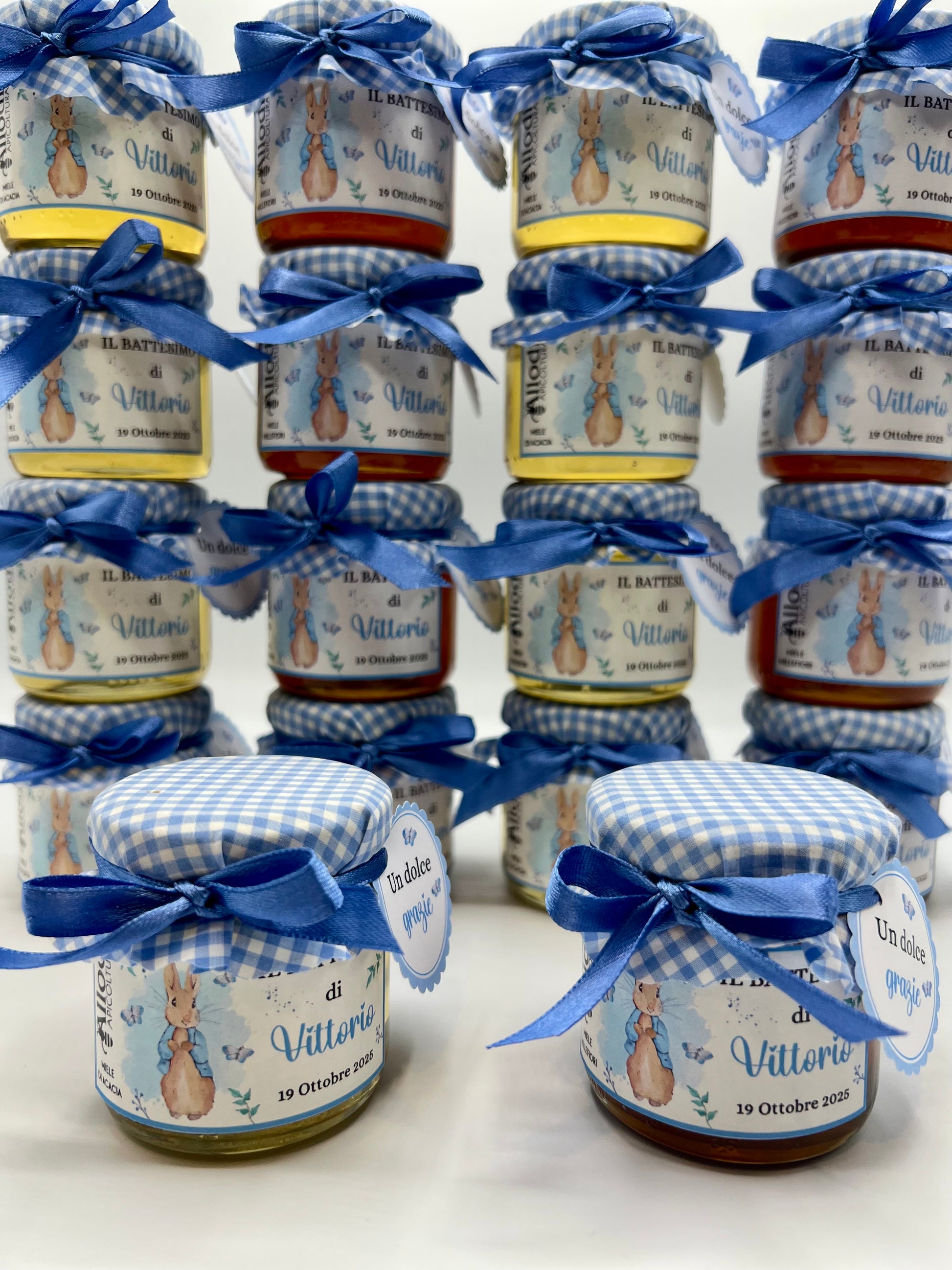Vasetto di miele da 110g con tag ed etichetta personalizzabile al 100%.
